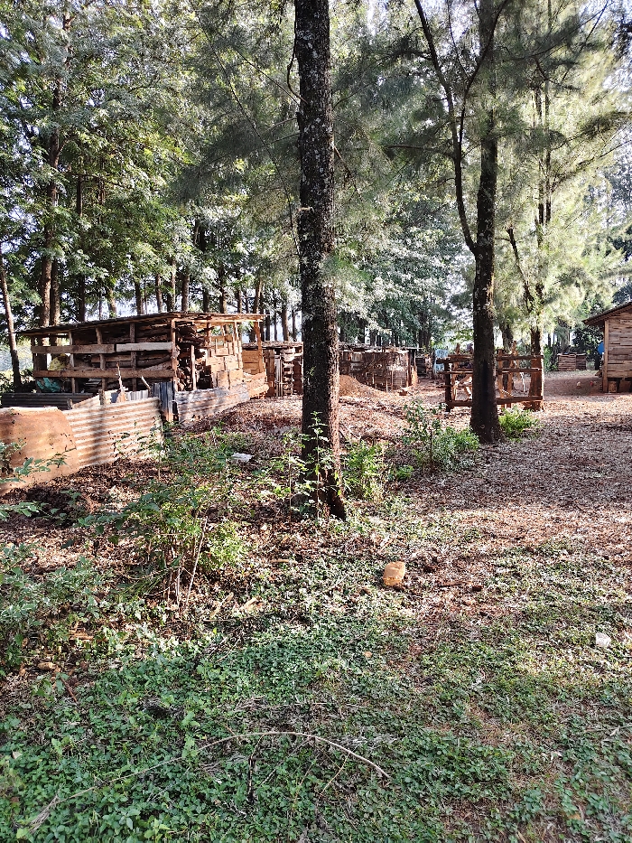 A rural landscape shows wooden structures, likely storage sheds, with corrugated metal in the background. Tall trees punctuate the scene, casting shadows on the ground. The foreground is covered with low-lying green vegetation, interspersed with patches of brown leaves and twigs. A single, possibly mushroom-shaped object sits prominently in the lower center of the frame. The overall impression is one of a working, perhaps agricultural, area blended with natural elements.