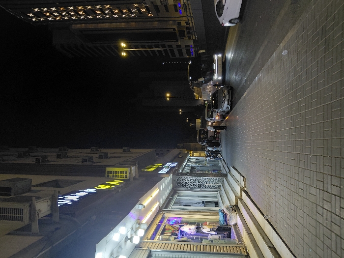 An urban night scene shows a street lined with shops and parked cars. The shops are illuminated with bright lights and colorful displays. A tall building with a patterned facade dominates the background. The street is paved with rectangular blocks, creating a textured surface. A few individuals are visible near the parked vehicles, suggesting pedestrian activity. The overall atmosphere is modern and vibrant.