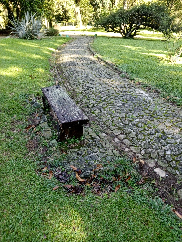 - "A stone path winds through a grassy area, lined with a wooden bench on the left" by FM-k2ZWC2, licensed under CC BY 4.0