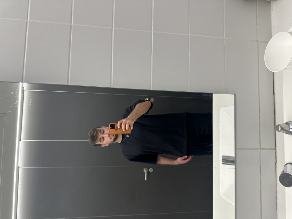 This image depicts a mirror selfie taken by a male subject in what appears to be an indoor public restroom