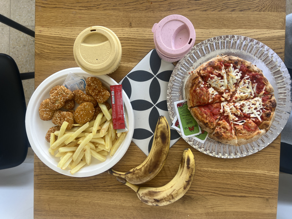 The image displays a wooden table laden with food and beverage items in Rosh Haayin, Israel. In the upper center, a white disposable plate contains golden-brown French fries and approximately ten heart-shaped, breaded food items coated in sesame seeds. A red ketchup packet and a small white sachet are also on this plate. To the right, a light yellow reusable cup with a matching lid is positioned. Below this arrangement, two ripe bananas, exhibiting significant brown spotting, rest directly on the wooden table surface. A black and white placemat featuring a geometric circle pattern is centered on the table. In the lower section, a small, personal-sized pizza, sliced into six pieces with a red sauce base and melted white shredded cheese, is presented on a silver-colored corrugated disposable plate. Adjacent to the pizza are two small green packets, labeled "CUP KETCHUP" in Hebrew and English. A pink reusable cup with a lid sits to the right of the pizza plate. The background in the upper left shows a white wall and a partial view of a black chair.