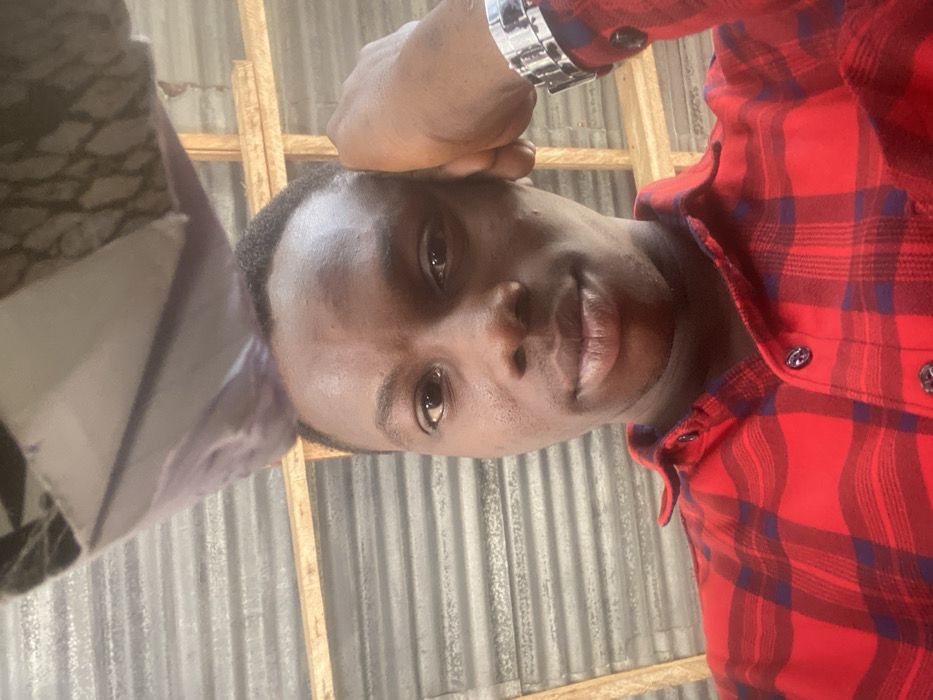 A young adult male, with dark complexion and short, dark hair, is centered in a close-up, chest-up shot. He wears a red and dark blue plaid long-sleeved collared shirt, with some buttons fastened. His expression is neutral with a slight upturn at the corners of his lips. A silver-toned metallic watch is visible on his left wrist. His right hand, clenched into a fist or resting as a support, is positioned near the right side of his head, out of full view. The background consists of a grey corrugated metal roof or ceiling structure, supported by light-colored wooden beams, indicating an overhead shelter. A light-colored, possibly white or pale purple, soft object or bag hangs partially visible from the ceiling structure in the upper center. The scene is consistent with an indoor or sheltered outdoor space using common building materials found in Ibadan, Nigeria; no specific landmark or precise location within the city is identifiable.