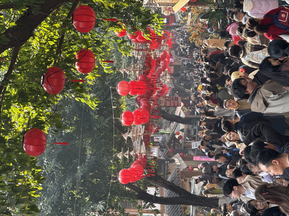 A vibrant street scene depicts a dense crowd of people. Red lanterns adorn the trees lining the street, creating a festive atmosphere. The crowd appears to be moving along the street, with buildings visible in the background, along with other decorative hangings. The scene is bustling with energy, capturing a lively moment in a crowded urban environment.