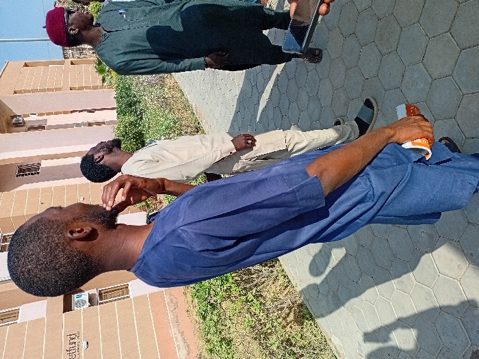 This image, captured in Kwazailewa, Nigeria, depicts an outdoor scene featuring three adult males on a paved walkway beside a building under bright daylight. In the foreground, an adult male with dark skin, short dark hair, and a short beard is visible from the side. He wears a dark blue tunic and matching trousers. His right hand is raised, with his index finger and thumb touching his beard. His left hand holds an orange and white cylindrical object. He is positioned at a slight angle, with his head turned partially away from the camera's direct line of sight. Behind him, a second adult male with dark skin, short dark hair, and a beard stands, dressed in a light tan tunic and trousers. He is looking upwards. Further to the right, a third adult male with dark skin is visible. He wears a dark olive-green tunic and trousers, a red cap, and dark sunglasses. He is holding a black smartphone horizontally in his left hand and appears to be looking towards the right side of the frame. The ground consists of grey hexagonal interlocking concrete pavers, showing distinct shadows from the individuals, indicating bright sunlight. To the left of the subjects, sparse green bushes are present. In the background, a multi-story building with a light brown facade is visible, featuring multiple windows and an air conditioning unit. A sign partially reading "Fethund" is visible on the building's left side. The sky is clear. The individuals are standing or walking in proximity but display no direct interaction.