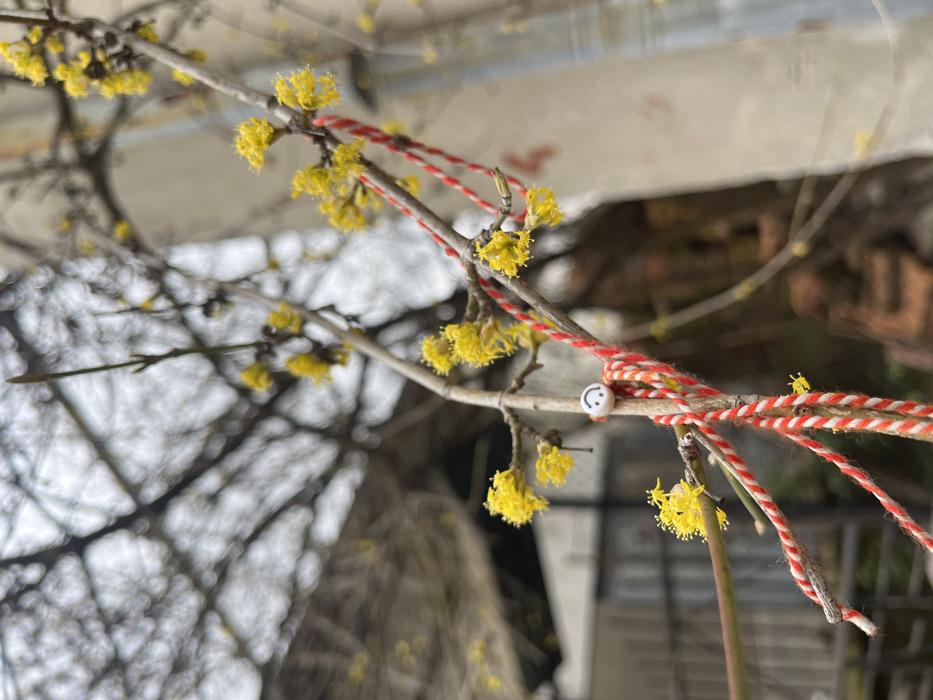 The image captures a close-up view of a flowering tree branch in Srednogortsi, Bulgaria, featuring numerous clusters of small, bright yellow blossoms. A traditional Bulgarian martenitsa, made of red and white twisted yarn, is wrapped around the branch. A small, white, spherical bead with a black smiley face is affixed to the martenitsa. The background, rendered with a shallow depth of field, shows bare tree branches against a light, likely overcast sky, along with blurred architectural elements resembling a building wall on the right and other structures on the left, consistent with an outdoor residential or village setting. No individuals are present in the frame.