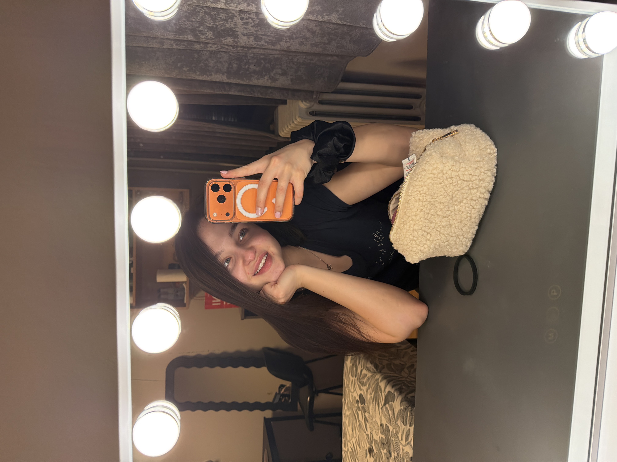 A young woman with long brown hair takes a selfie in a mirror with bright lights surrounding it. She is wearing a black shirt and has a black scrunchie on her wrist. She holds an orange phone with a white ring on the back. Next to her is a cream-colored fuzzy purse. The reflection in the mirror shows a room with patterned upholstery, a metal-framed chair, and a shelf. While location cannot be verified from the image, it is not possible to determine if it is in Sofia, Bulgaria without additional information.