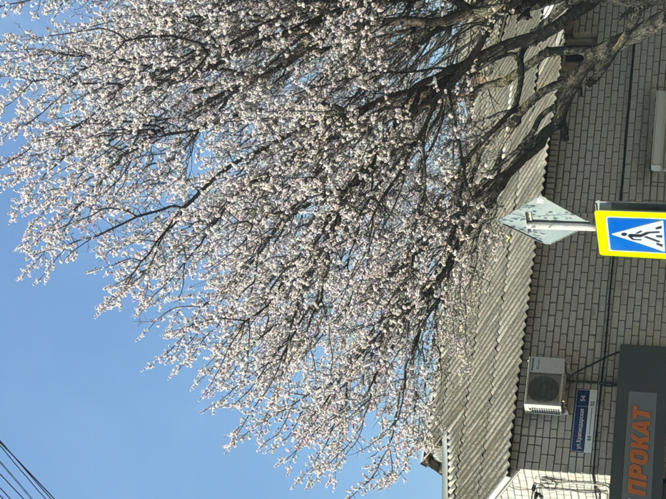 The image presents an urban street scene in Anapa, Russia, under a clear blue sky. A large deciduous tree, currently in full bloom with numerous small white flowers, occupies the central and upper-right portions of the frame. Below the tree, a building with a light-colored brick facade and a grey corrugated roof is visible. A Panasonic air conditioning unit is mounted on the building's exterior. A street sign affixed to the building reads "ул. Краснодарская 54" in Russian, with smaller numbers "54" and "52" below, indicating Krasnodarskaya Street, near building numbers 54 and 52. A partial sign displaying the Russian word "ПРОКАТ" (RENTAL) is visible on the lower left of the building. In the lower right, a yellow diamond-shaped sign with a blue square indicating a pedestrian crossing is present. Overhead electrical wires are visible against the sky in the upper-left quadrant. No individuals are present in the scene.