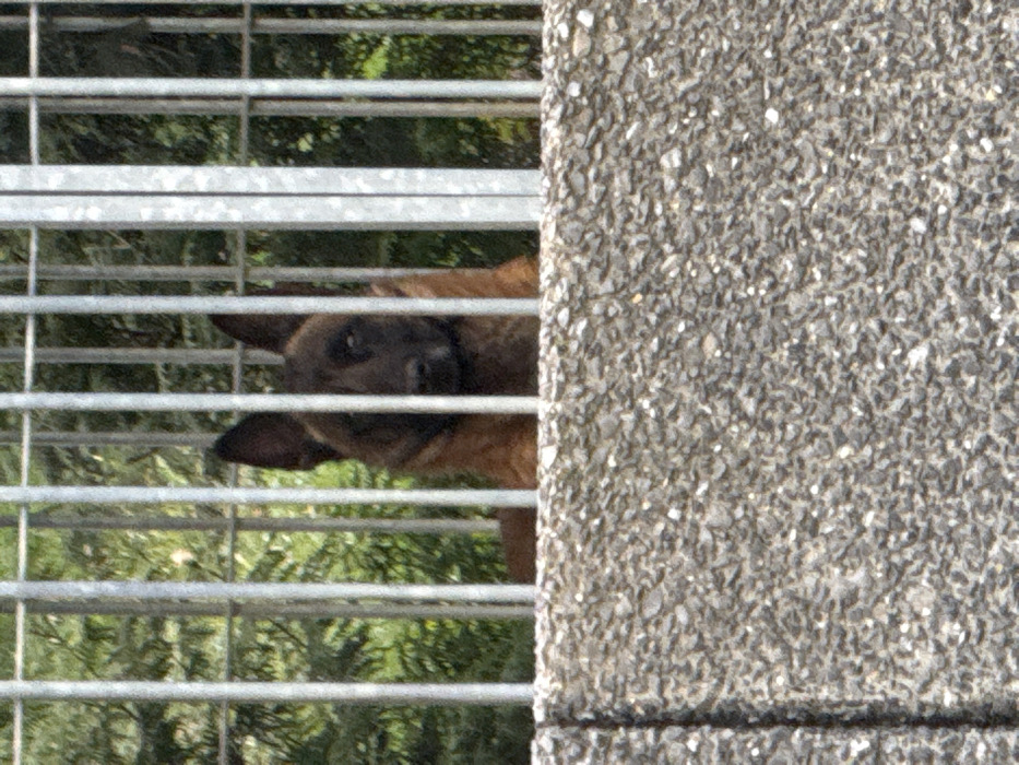 A Belgian Malinois dog is partially observed in Marche-en-Famenne, Belgium, positioned behind vertical metal bars and a textured concrete wall