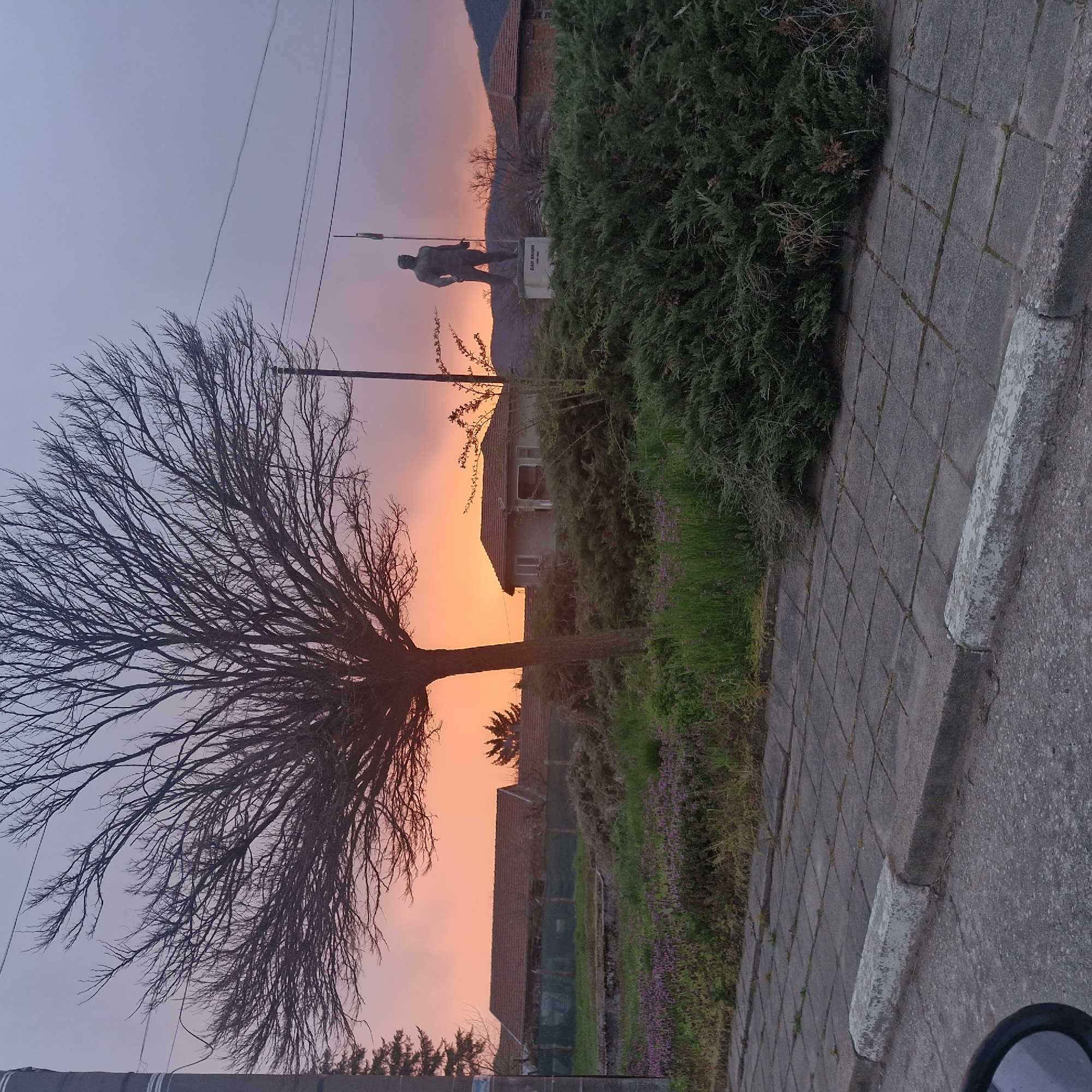 The image depicts a landscape in Unknown, Unknown, taken during a colorful sunset. A bare tree with thin branches occupies the left side of the frame, silhouetted against the sky. To the right of the tree, there is a statue of a man holding a spear, standing on a pedestal with writing on it. Behind the statue, there is a building and a large bush. A path made of gray stones runs along the right edge of the image, with some green grass and small purple flowers growing nearby. The sky is colored with hues of orange and pink from the setting sun.