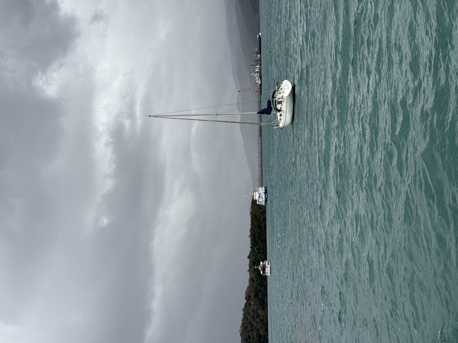 The image depicts a wide expanse of choppy, turquoise-green water under a heavily overcast sky with dark gray clouds. This scene is situated in the city of Dubravcevina, Montenegro. In the mid-right, a stationary white sailboat with a single mast and a furled blue sail at the bow is visible. No individuals are present on board. Further back, two ferries navigate the water; the one on the left is smaller and white with a dark upper deck, while the one to its right is larger, white with blue trim, and appears to be a car ferry. The left background features a densely forested landmass with green and autumnal trees. The right background reveals industrial elements, including a barge equipped with a crane or drilling rig and other moored vessels, set against distant mountains that partially recede into the cloudy horizon.