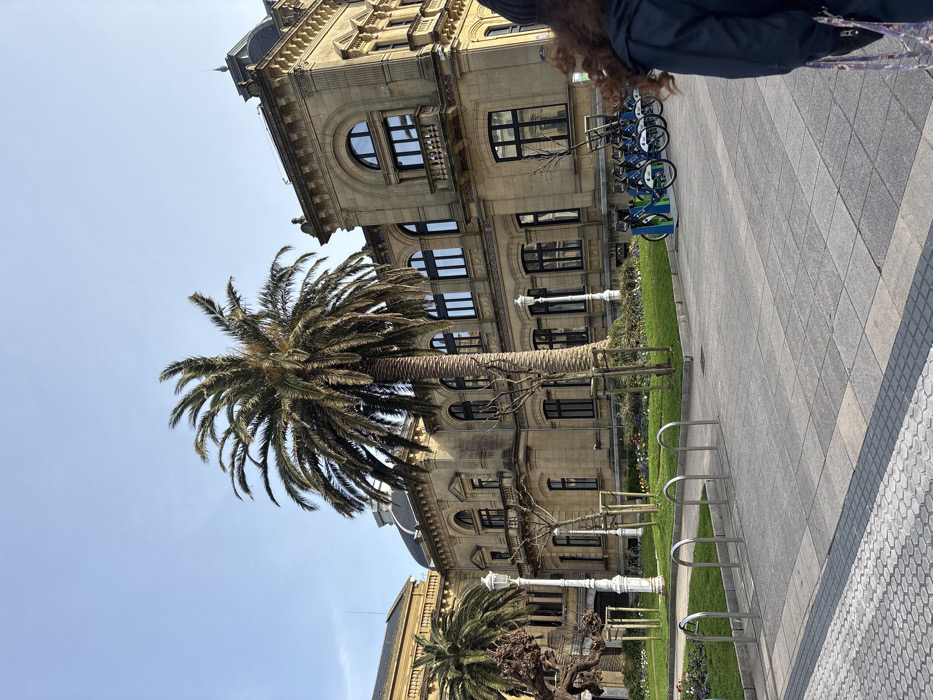 The image depicts a detailed outdoor scene at Plaza de Gipuzkoa in San Sebastián, Spain. The dominant structure in the background is the Diputación Foral de Gipuzkoa building, a multi-story edifice constructed from light-colored stone. It features numerous arched and rectangular windows with dark frames, ornate balconies, decorative pilasters, cornices, and a prominent dark-domed roof section on the right. A similar architectural style building is partially visible to the far left. In the mid-ground, a large palm tree with a thick trunk and dense green fronds stands centrally within a landscaped grassy area. This green space also contains several smaller deciduous trees with bare branches, some supported by wooden stakes, and patches of small flowering plants. Multiple ornate white street lamps with dark caps are positioned throughout the park-like setting. The foreground consists of a paved pedestrian area with a mosaic of gray square and rectangular tiles, bordered by a strip of dark gray hexagonal paving. Three silver U-shaped bicycle racks are visible on this paved surface. To the right, approximately six blue and green rental bicycles are parked in a row at a designated charging station. The back of an individual's head, displaying dark, curly hair, and their right shoulder clad in a dark jacket, are visible in the lower right portion of the frame. The sky is clear and light blue.