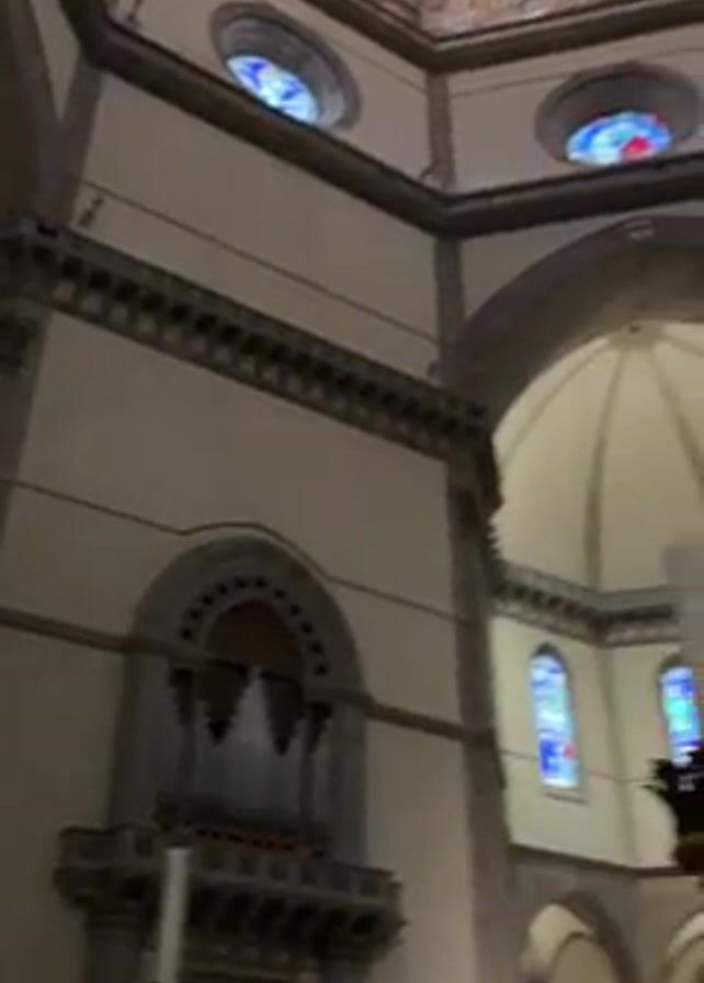 interior of a cathedral. The camera pans upwards, revealing a high, arched ceiling adorned with detailed frescoes depicting various scenes. There are several round stained-glass windows positioned around the ceiling. Below the ceiling, there is a semicircular arch leading to a smaller domed area with stained glass windows. On the wall beneath the archway is a pipe organ mounted on a balcony. In the foreground, there are partially visible ornate golden candle holders, and a crucifix is visible in the background.