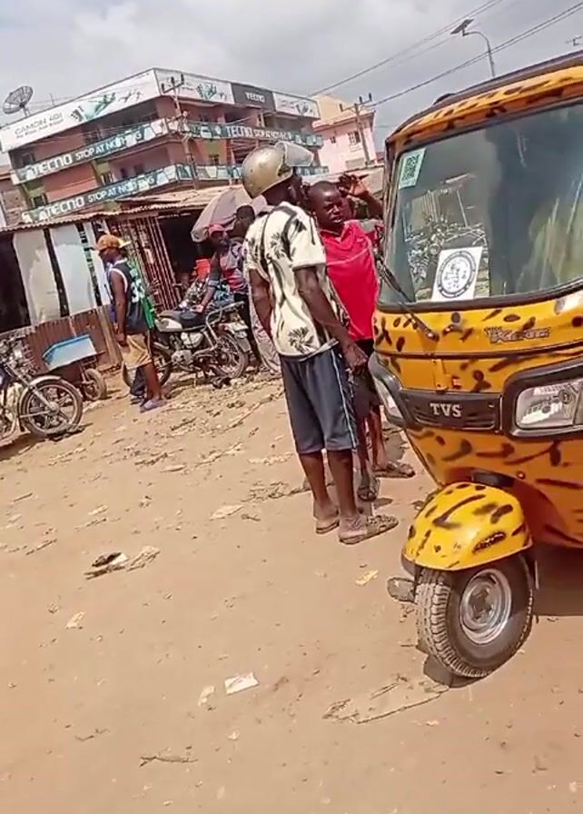 dirt road with parked motorcycles and vehicles, and people standing and walking around. There are several small buildings or stalls visible. Some of the buildings have signs for Tecno and "MBANESE MOTORS". A yellow TVS tricycle with black stripes is parked in the foreground. The sky is partly cloudy. The scene appears to be a busy commercial area in what may be an African town or city.