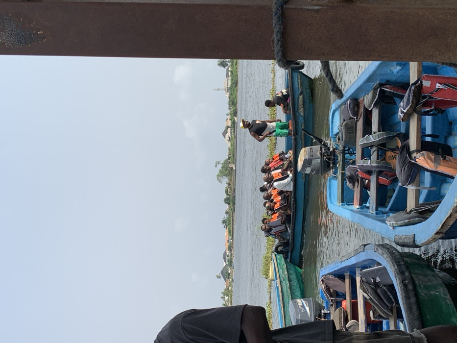 The image captures a waterfront scene in Ibasa, Nigeria, under a hazy sky