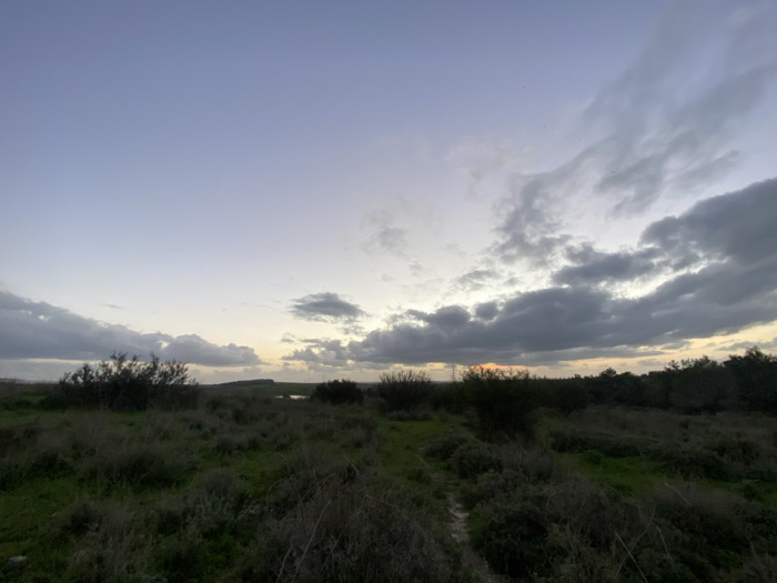 A tranquil landscape shows a field of green and brown vegetation beneath a cloudy sky. Bushy shrubs dot the scene, leading towards a distant treeline and horizon. A small body of water reflects the muted light. The sky transitions from a light blue to darker, gray tones with glimpses of sunlight peaking through the clouds. The overall scene suggests dusk or dawn in a natural environment.