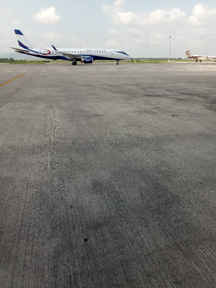 The image displays an airport tarmac in Gwaska, Nigeria, under a partly cloudy sky