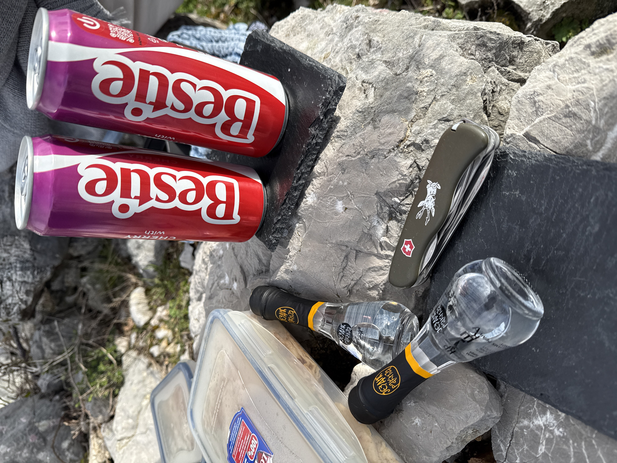 The image displays a collection of items positioned on rugged, grey rock formations characteristic of mountainous terrain in Bogdašići, Montenegro. In the upper right quadrant, two unopened aluminum beverage cans, primarily red and magenta with "Bestie" branding and "CHERRY with" text, stand upright on a black, rough-cut slate coaster. A blue and grey knitted fabric object is partially visible behind these cans. In the lower left quadrant, two small, clear glass bottles containing clear liquid are visible. Each bottle features a black and yellow label with the text "JEZAM RAKIJA" and is sealed. One bottle rests on the rocky surface, while the other is partially on a second black, rough-cut slate coaster. An olive green multi-tool pocket knife, closed and displaying a white deer or stag emblem, lies on the rock surface adjacent to the bottles. Two translucent plastic food storage containers, both with blue and white lids, are present on the rock to the left. The contents of the foremost container appear light brown and solid. The surrounding environment consists of exposed, weathered rock, with sparse, dry vegetation visible in crevices and in the background. The scene is illuminated by natural light. No individuals are present in the image.