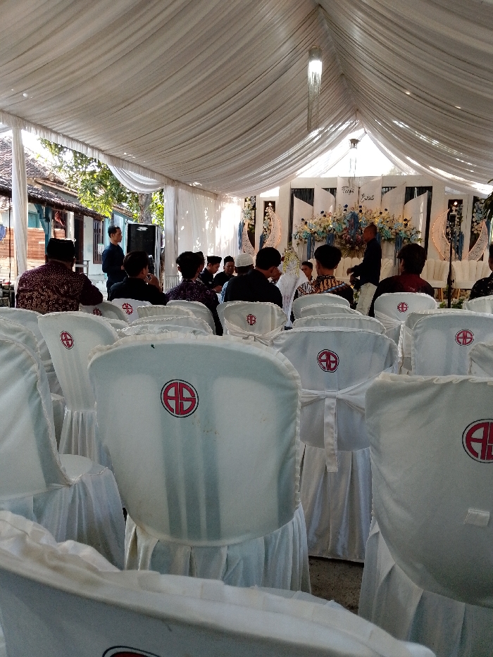 The image displays a daytime event taking place under a large white fabric tent structure in Juwana, Indonesia. Approximately twenty individuals are visible, primarily men, seated in white-covered chairs arranged in multiple rows facing a decorated stage. Many chair covers feature a circular red logo containing the letters "AS." The tent ceiling is draped with white fabric, from which a slender, ornate light fixture hangs centrally. The stage area at the far end is adorned with white panels, blue and white floral arrangements, and vertical crescent moon-shaped light fixtures. A table is positioned on the stage. Several individuals are standing on or near the stage, including one man in a dark shirt and another in a lighter shirt. One individual at the front, partially obscured by other attendees, wears a white head covering. On the left side of the tent, a man in a dark shirt stands near a black speaker unit. Beyond the tent structure on the left, traditional residential buildings with tiled roofs, wooden walls, and light blue window or trim details are visible under clear skies. The individuals in the foreground are observing the proceedings on the stage.