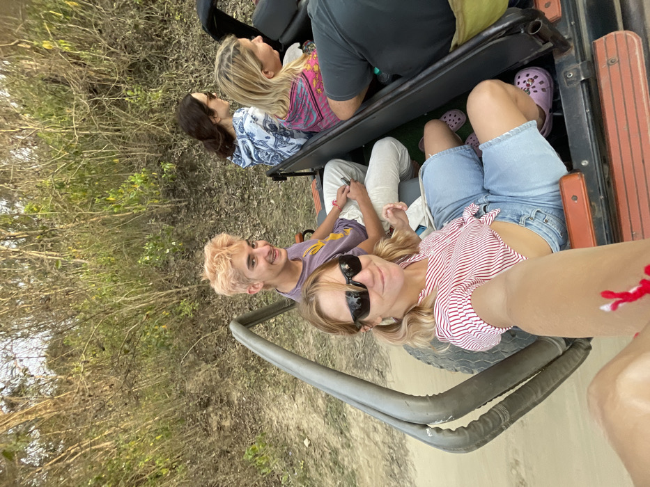 An open-top safari jeep on a dirt track in a dry, scrub jungle environment near Haridwar, India, likely within Rajaji National Park, captures five individuals. The image is a selfie taken by a blonde female in the front passenger seat, wearing black sunglasses, a red and white striped crop top, light blue denim shorts, and purple Crocs. Her extended right arm is visible, featuring a red string bracelet. Behind her, a young male with light orange-pink hair, wearing a purple t-shirt and light pants, smiles towards the camera while holding a white smartphone. Further back, a blonde female in a pink and yellow patterned top is visible in profile. Behind her, a female with long dark hair, wearing sunglasses and a blue and white patterned top, looks to her right. The fifth individual, possibly a driver or guide, is partially visible in the far right foreground, wearing a dark top, with a blue water bottle and green bag next to them. The surrounding environment consists of dense, dry green and brown foliage and bare branches under soft, natural light.