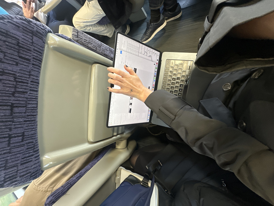 An overhead view captures the interior of a passenger train carriage, located within the city of Tonbridge and Malling, United Kingdom. The primary subject, seated, is seen from the chest down, wearing a dark grey or black jacket with visible buttons and a collared lapel. Their left arm extends forward, with a silver Apple MacBook laptop resting on their lap. The laptop screen displays a graphical user interface featuring multiple panels, thumbnails, and what appears to be a data visualization or graph on the right side. The subject's right hand, adorned with dark-painted fingernails and a small star tattoo on the wrist, hovers above the laptop screen, fingers slightly splayed, indicating interaction with the display. In the immediate foreground, a black bag or backpack is visible on the floor next to the subject's left leg. The train's interior features light grey plastic seat backs with darker blue, patterned fabric upholstery on the lower portions of the seats. To the left, a passenger's legs, clad in light brown trousers, are visible in the seat directly in front. A blue bag rests on the floor next to them. To the right, legs of additional passengers are visible, including one wearing white trousers and dark shoes with white soles, and another in dark trousers and black shoes. The train's floor is covered in dark grey carpeting.