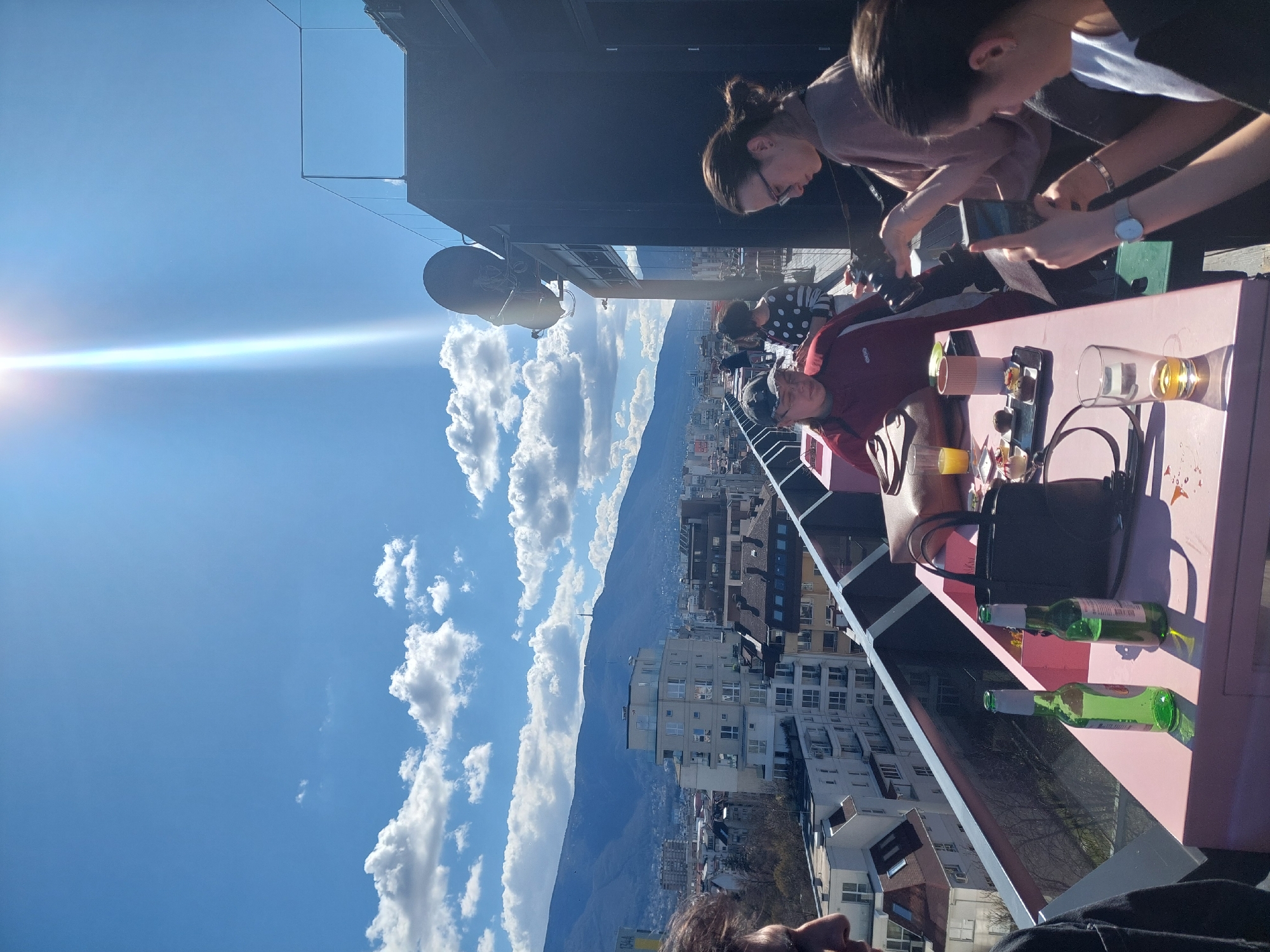 group of people on a rooftop bar in Sofia, Bulgaria. A pink table holds drinks and personal belongings, including beer bottles, a purse, glasses, and phones. People are gathered around the table, some looking at phones. The city of Sofia is visible in the background, including buildings and a mountain range. The sky is blue with scattered clouds, and the sun is shining brightly.
