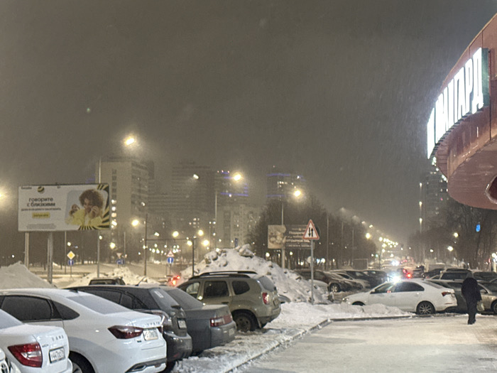 - "The scene depicts a snowy night in Naberezhnye Chelny, Russia, looking across a multi-lane street towards several urban buildings" by FM-5rUOv2, licensed under CC BY 4.0