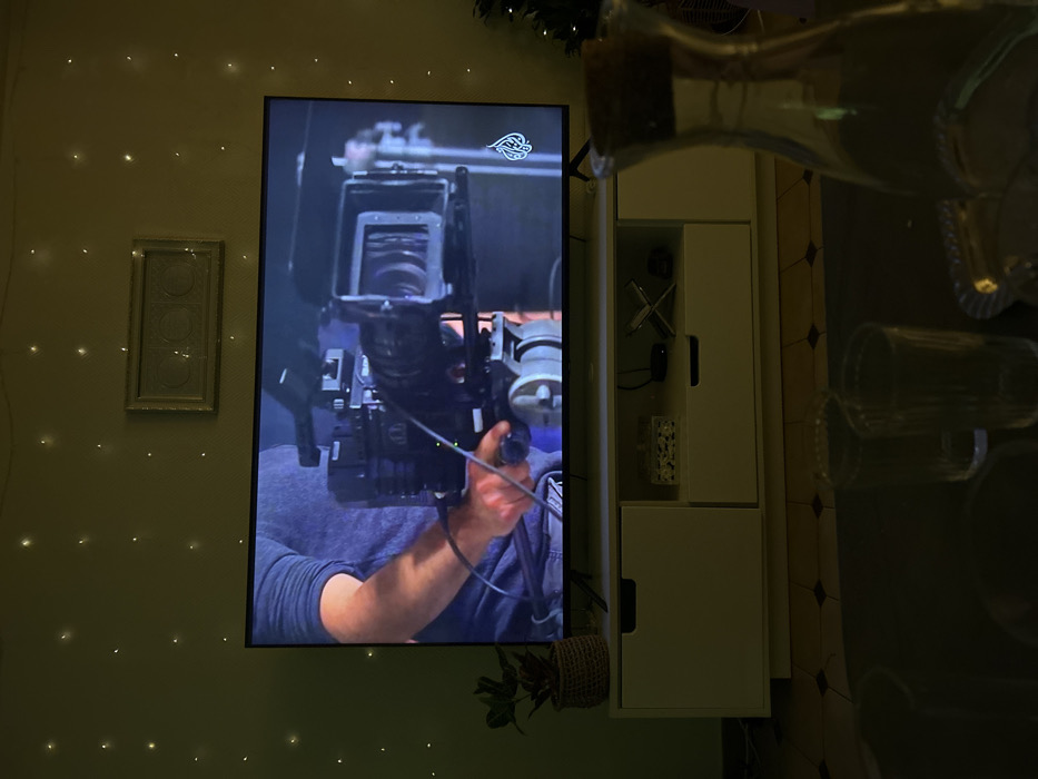 A television screen displays a person holding a professional video camera. The screen is mounted on a wall adorned with string lights and a framed artwork. To the right of the screen is a white cabinet with decor items inside. A wine bottle and glasses are visible, out of focus, reflecting on a dark surface. A small potted plant is placed near the bottom of the cabinet.