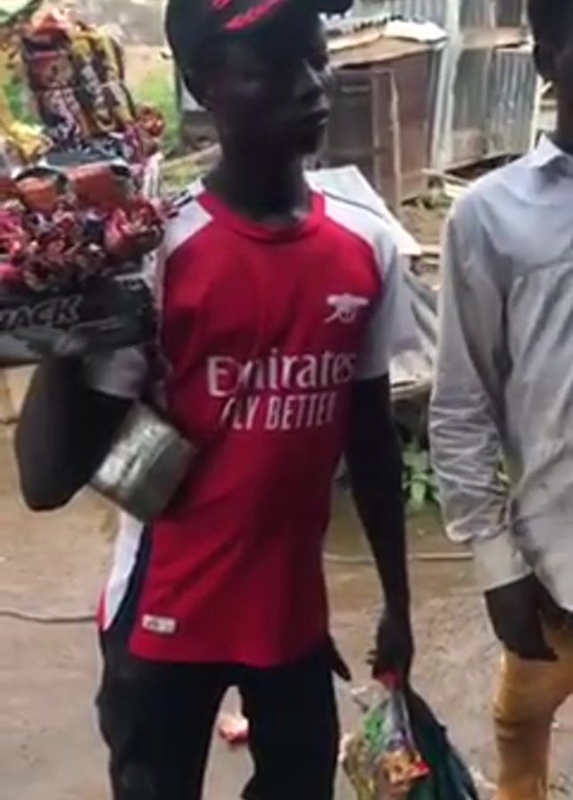 Here's a detailed description of the video: The video shows three individuals in what appears to be a semi-urban setting. One person, wearing a red and white Arsenal jersey with a black cap, is holding a tray filled with colorful snacks on their shoulder and a plastic bag in their hand. They appear to be a vendor. Another person, wearing a light-colored long-sleeved shirt and mustard-colored pants, stands beside the vendor. They are obscured from the waist up for a brief period as a dark wooden beam is moved in front of them. The third person is partially visible, mostly their arm, as they move the wooden beam. The background includes structures made of corrugated metal sheets, suggesting a low-income or informal settlement area. The ground appears to be damp, possibly after rain. A chicken is visible briefly in the lower left corner of the frame.