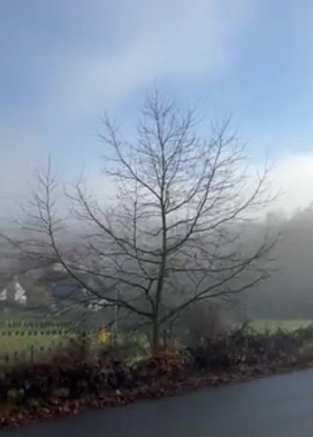The scene is a foggy, rural landscape. A bare tree stands in the foreground, slightly right of center, with a low hedge behind it. Beyond that, a green field or pasture slopes upward to a cluster of buildings, possibly a small village or farm. Fog obscures the background, making it difficult to see details, but a hillside is faintly visible in the distance. A paved road runs along the bottom of the frame. The sky is a light blue, transitioning to white with the fog. There is a sound of barking.