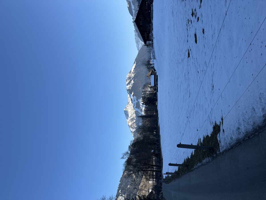 The image presents a winter landscape in Saanen, Switzerland, under a clear, vivid blue sky. A dark, paved road occupies the left foreground, running parallel to a multi-strand wire fence supported by light-colored wooden posts. To the right of the fence, a field is covered in a layer of white snow, exhibiting some visible patches of brown earth and vegetation. In the midground, a line of bare deciduous trees with dark branches stretches across the scene. Beyond these trees, a traditional, dark-wood chalet-style building with a light-colored roof is prominently situated on the right side. Another smaller, lighter building is visible further left in the midground. The background is dominated by snow-capped mountains, featuring visible rock faces and forested sections, ascending beneath the cloudless sky. No individuals, animals, or explicit actions are present in the frame.