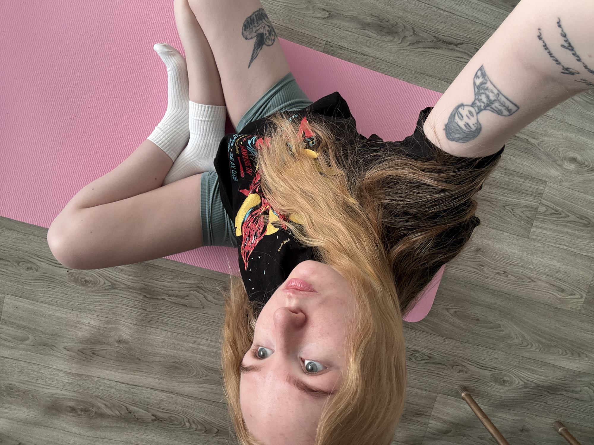 An individual is depicted lying on a pink yoga mat over a light grey wood-grain laminate floor in an interior location within Chaikovsky, Russia. The person, with long light-brown hair, blue eyes, and freckles, is wearing a black t-shirt with a colorful graphic design, light green ribbed shorts, and white ribbed ankle socks. Her legs are bent and crossed at the ankles, with the right leg crossed over the left. Her head is tilted, with her gaze directed towards the camera. Observable tattoos include a black outline of a winged creature on the left upper thigh, a black outline of a stylized bust with a bob haircut on the left forearm, and dark script, appearing to be Cyrillic, on the left wrist area. In the bottom-left corner of the frame, two slender, light-colored rods are partially visible.