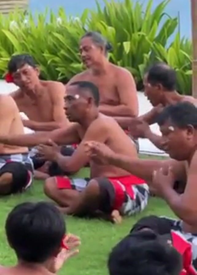 A group of partially nude men are sitting in a circle on grass. The men are all facing inward. All but one of the men are wearing black and white checkered skirts with a red waistband. The men appear to be performing a chant or dance, raising their hands and arms up and moving them to the sides. The group is located outside with the ocean visible in the background.