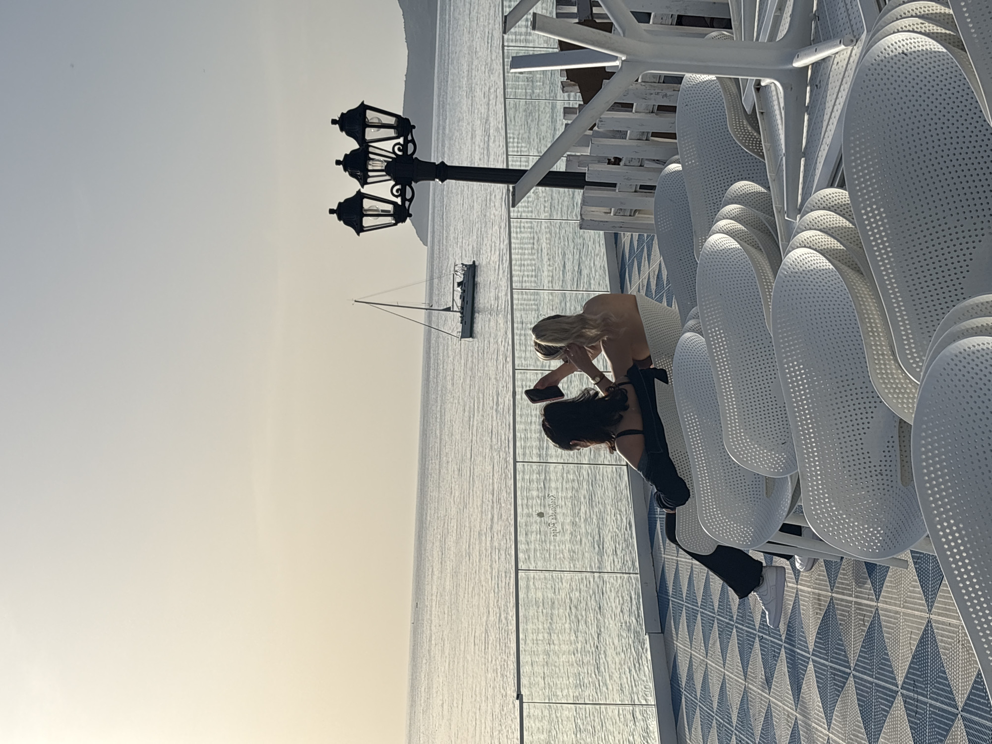 Two women are sitting near a coastline. One woman with blonde hair is turned towards a woman with black hair who is holding a black phone. Behind them are stacked white chairs. Behind the women is a black triple lamp post and further in the background is a sailboat. The coastline is located in Bar, Montenegro.