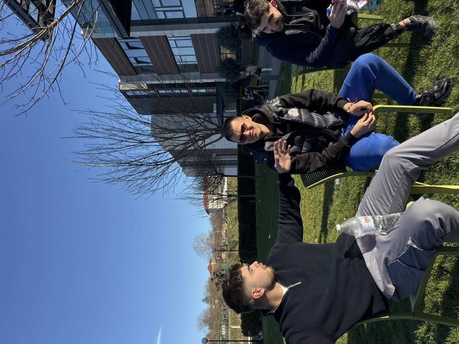 Three young adult males are seated on light green plastic chairs on a sunlit grassy lawn. The scene is set outdoors, with a clear blue sky overhead and visible shadows indicating bright sunlight. The background features modern multi-story buildings characterized by large windows and facades combining grey and dark brown paneling, consistent with the architecture of the American University in Bulgaria (AUBG) in Blagoevgrad. Bare deciduous trees are visible, suggesting late winter or early spring. The leftmost man, with dark hair and a clean-shaven face, wears a dark blue quarter-zip sweater and light grey cargo pants. He is positioned facing right, gesturing with his left hand extended towards the central figure as if in conversation. A clear plastic bottle of "Gornya Banya" mineral water rests on his lap. The central man, with short dark hair and wearing red-tinted sunglasses, is dressed in a black hooded sweatshirt, a black puffer vest with an emblem, blue sweatpants, and black sneakers. He is smiling and looking towards the leftmost man, with his hands clasped between his knees. A red bracelet is visible on his right wrist. The rightmost man, possessing dark hair and a beard, wears a dark hooded jacket. He is smiling and also looking towards the leftmost speaker. A crumpled plastic item is near his lap. The three individuals are engaged in a social interaction, appearing to be in conversation. In the distant left background, further buildings with red roofs and additional trees are discernible.
