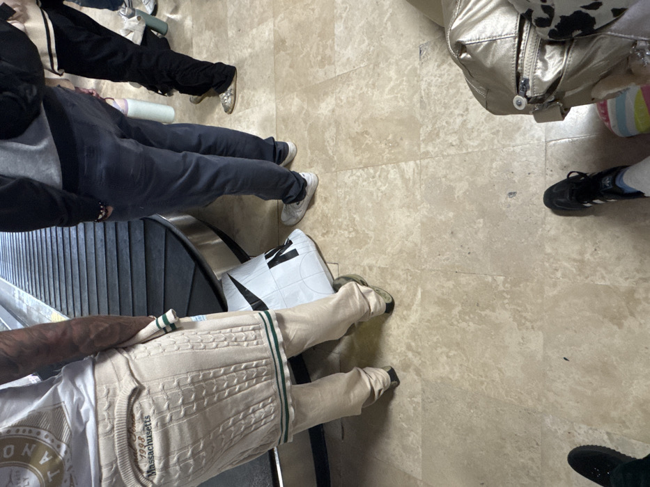 group of people standing on a beige tiled floor. A person wearing a white shirt and light-colored sweater vest with khaki pants and sneakers stands to the left, near a black escalator. Another person wears black pants and sneakers. A silver purse sits on the right with a pair of black sneakers nearby. There is also a white Nike shopping bag on the floor. The perspective is from overhead, and the scene appears to be indoors.