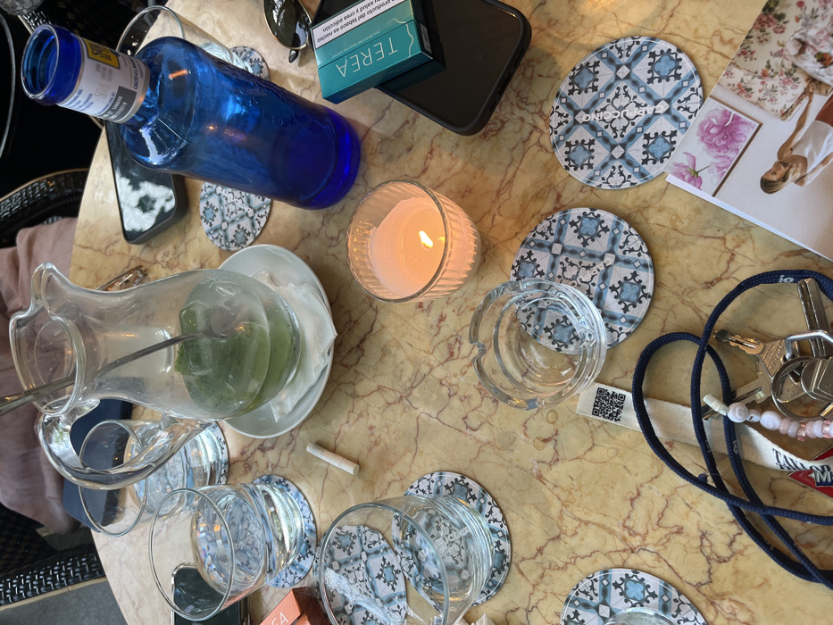 A marble table in Madrid, Spain, at 40.421, -3.688, is covered with objects including a glass pitcher with green liquid, a glass of water, a lit candle, an empty glass ashtray, a blue glass bottle, a pack of cigarettes, a mobile phone, a white card with a QR code, a bunch of keys attached to a lanyard, and a magazine featuring a woman in a white tank top. The objects are placed on a table with blue and white patterned coasters.