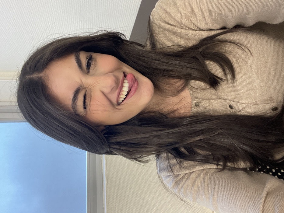 A close-up, front-facing portrait depicts a female subject indoors. She has long, dark brown hair, centrally parted, extending over her shoulders. The subject's left eye (viewer's right) is tightly closed in a wink, causing creasing around the eye. Her mouth is open in a wide smile, displaying upper and lower teeth, and her tongue is extended slightly to the left (viewer's right). She wears a light beige, long-sleeved, ribbed cardigan with visible dark, circular buttons down the front. The background on the subject's left features a window with a light-colored frame, revealing an overcast blue-gray sky. To the subject's right, a plain white wall with a subtle textured finish is present. The scene is located within a building in Montpellier, France.