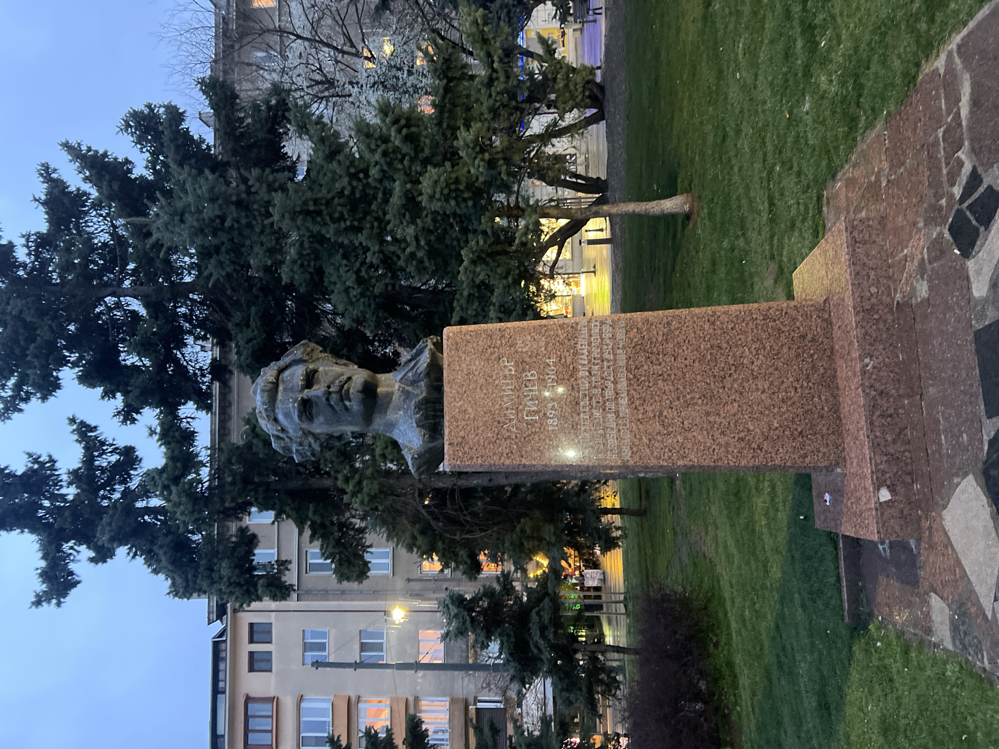 bronze bust of Dimitar Gichev (1893-1964) on a tall, rectangular, reddish-brown stone pedestal. The pedestal has inscriptions in Bulgarian. The bust and pedestal are located in a park with green grass and mature trees. A building with lit windows is visible in the background. The image was likely taken at dusk. The scene appears to be located in Sofia, Bulgaria, given the name inscribed on the monument.