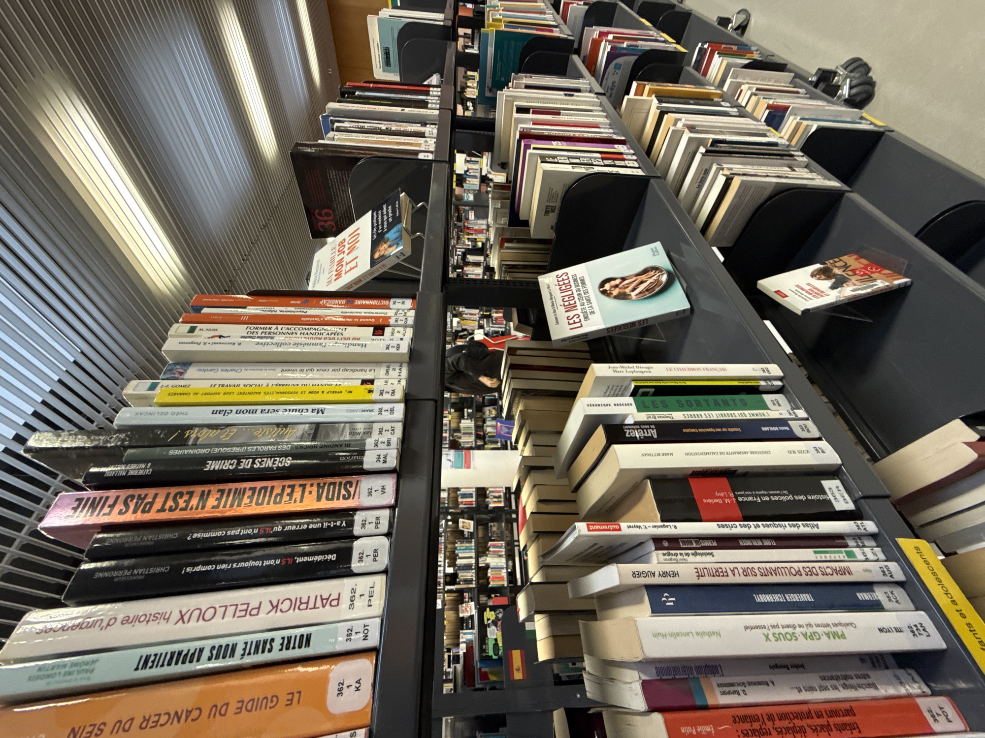 shelves full of books in a library setting, likely in Strasbourg, France. The books are arranged on shelves with black dividers. The spines of the books are visible, displaying a variety of titles and authors. The books are a mix of genres and subjects, including topics such as health, social issues, crime, and literature. The shelves extend into the distance, with other books visible in the background. The lighting appears to be from overhead fluorescent lights.