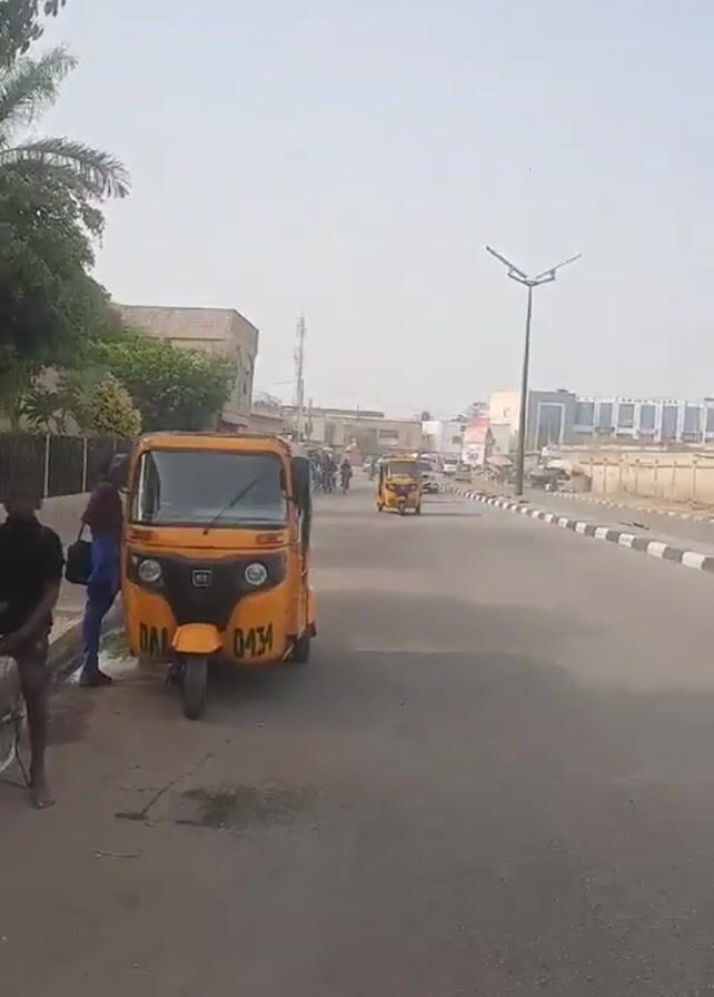 The video, recorded in a busy urban setting, showcases daily life. Initially, two young individuals are seen with bicycles near a yellow auto rickshaw marked with the number 0434. One of them is sitting on their bicycle. A man is standing close to the auto rickshaw, seemingly engaged in conversation with the driver. The setting includes a fenced area and a tree providing shade. As the video progresses, the camera pans across the street, revealing a longer view of the road and a person walking on the sidewalk. Further along, the video captures a street filled with more yellow auto rickshaws, traffic, and people on bicycles, all moving in different directions. The overall atmosphere is of a bustling urban environment.