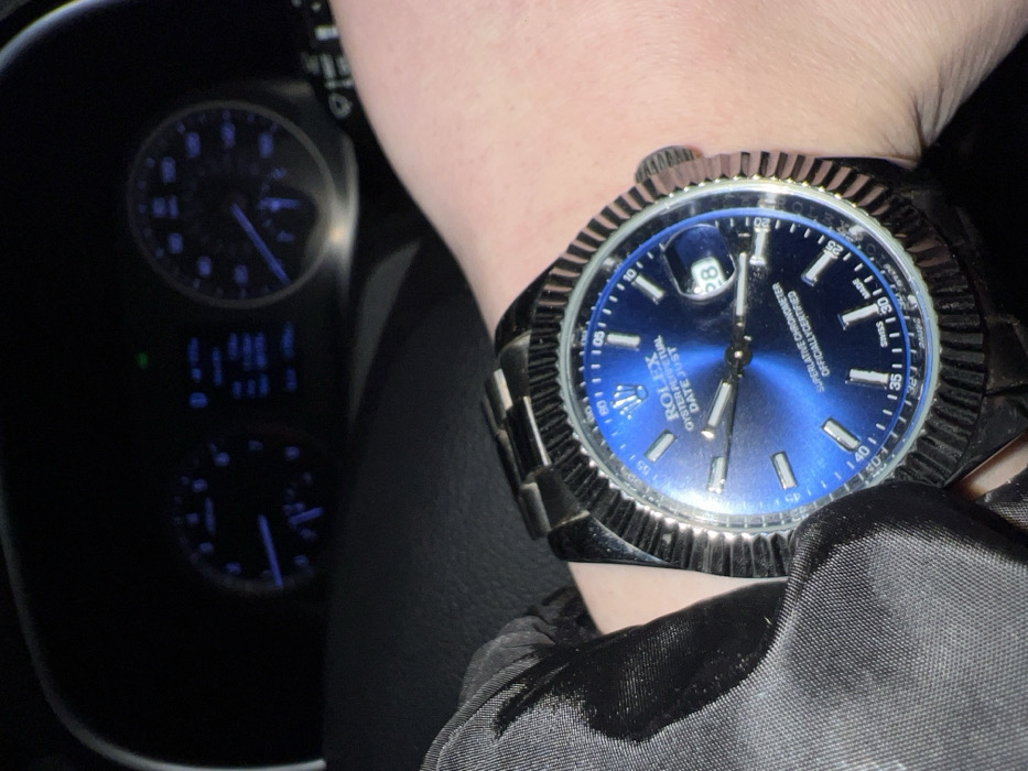 - "The image depicts a close-up view of a person's left forearm and hand, wearing a Rolex Oyster Perpetual Datejust wristwatch, inside the interior of a vehicle in the city of Burgas, Bulgaria" by FM-BfiRL2, licensed under CC BY 4.0