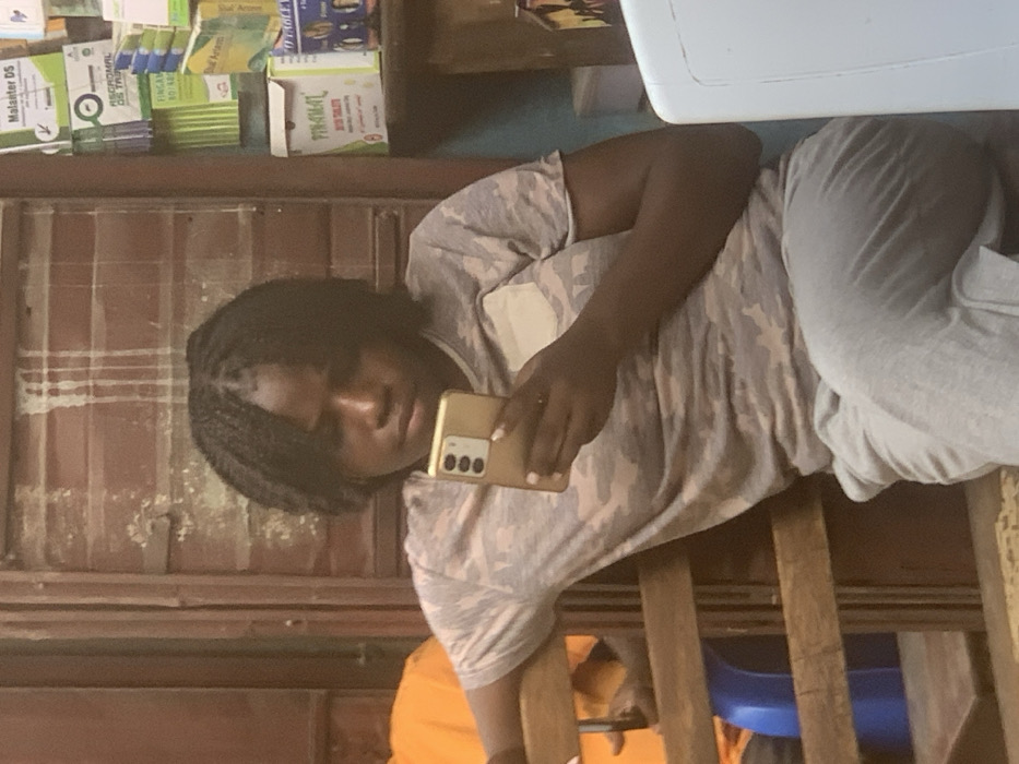 A woman with dark skin and braided hair lies on her side, using a gold-colored smartphone. She is wearing a grey camo-patterned shirt and light grey pants. She is positioned atop a wooden slatted surface. Books and medication boxes are stacked behind her. An orange-colored garment and a blue object are partially visible below.