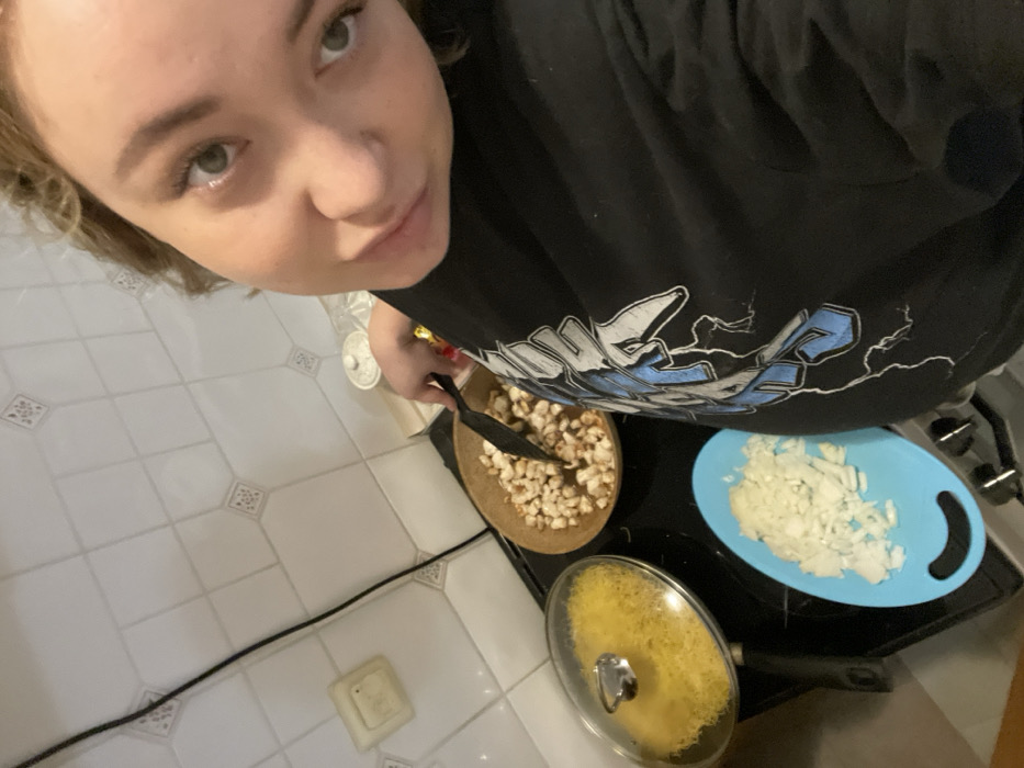 A woman is pictured from a high angle, looking at the camera, while cooking in a kitchen