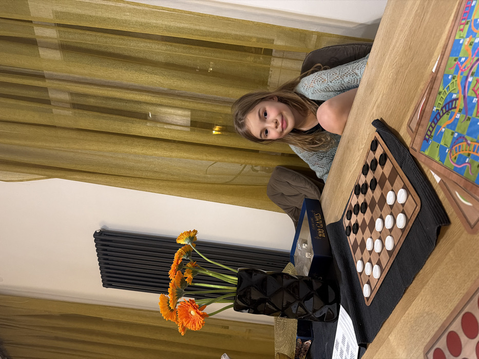 An indoor scene features a young female individual seated at a wooden table, engaged with board games and a floral arrangement. The individual, appearing to be a child approximately 7-10 years old, has light brown hair and is wearing a dark shirt beneath a light blue open-knit cardigan. She is looking forward, directly at the camera, with a slight smile. On the wooden table, a wooden checkerboard with black and white pieces is positioned on a black rectangular mat. White pieces are set on the first three rows, and black pieces occupy the first two rows. A dark, faceted vase containing a bouquet of orange Gerbera daisies stands to the left of the checkerboard. Behind the vase, an open blue box labeled "CLASSIC GAMES" and "100 GAMES" reveals several white dice inside. A stack of game board cards, with one depicting a colorful "Snakes and Ladders" style game, is visible in the lower right foreground. The background consists of light-colored walls, a dark vertical panel radiator mounted on the left wall, and two windows draped with sheer, mustard-yellow curtains. The room's lighting suggests an evening setting, with reflections of interior or possibly exterior lights visible through the curtains. The specific city location of Grad Rijeka, Croatia, is not visually identifiable from the content of this image.