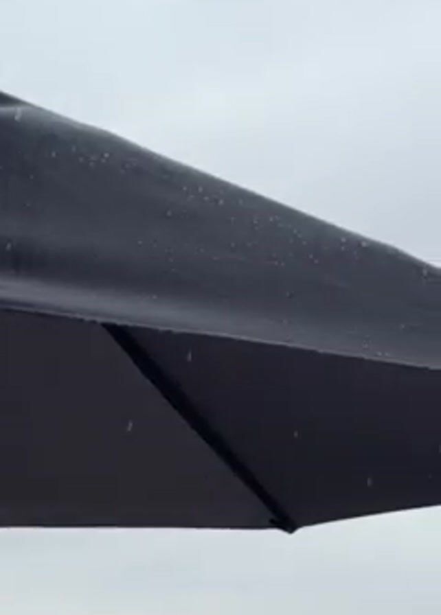 black umbrella in the rain. Water droplets are visible on the fabric of the umbrella. In the background, there are buildings and a gray sky. The camera is static, focusing on the umbrella.
