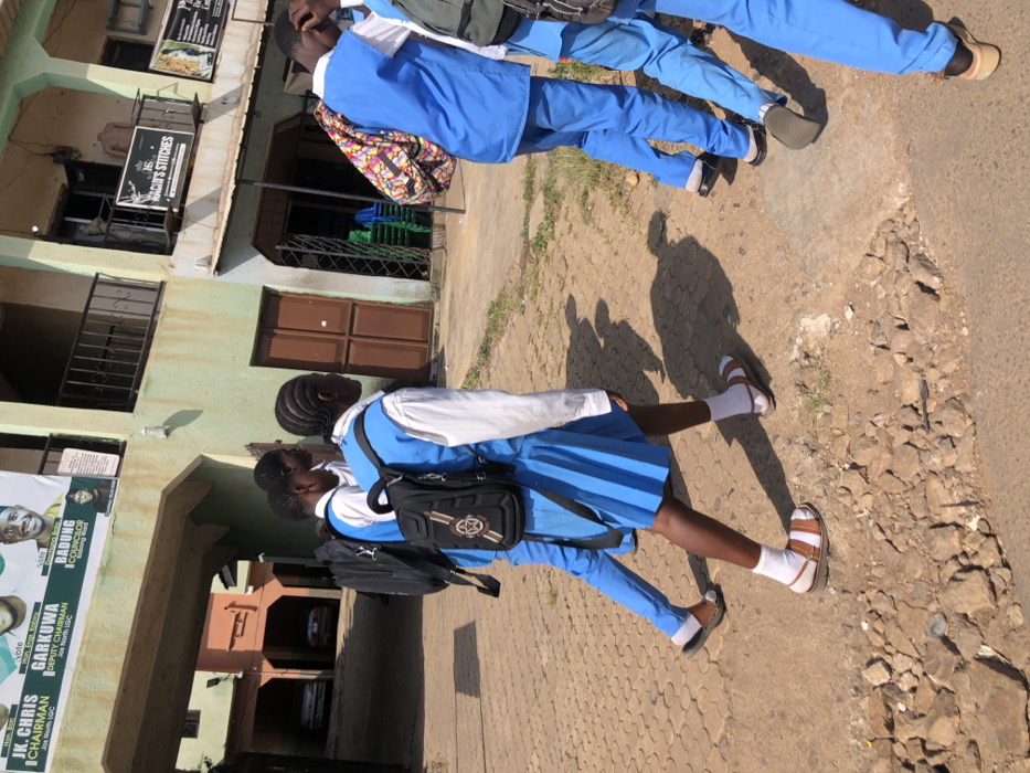 The image captures a street scene on Rukuba Road, Nigeria, under daylight conditions, indicated by strong shadows. Five individuals, appearing to be students in uniforms, are walking from left to right across the foreground. The students are dressed in white long-sleeved shirts. Four wear blue trousers, and one female student in the immediate foreground wears a blue pleated skirt with white socks and brown sandals. All individuals carry backpacks; the female student's backpack is black with a white star emblem, while another student carries a colorful patterned bag over their shoulder. The background consists of two-story buildings. The building on the left, colored light green/tan, features a prominent archway that leads to an alley where two light-colored cars are parked. A large political campaign banner is affixed to the upper facade of this building, displaying text such as "Vote Hon. Bsp JK CHRIS CHAIRMAN Jos North LGC," "Vote Hon. Engr. Kebeng GARKUWA DEPUTY CHAIRMAN Jos North LGC," and "Vote Doctoino Bolu BADUNG COUNCILOR Kobeng Ward," along with candidate portraits. The building on the right, also light green/tan, has a ground-floor shop with a metal grate, revealing stacked green plastic chairs inside. On its upper level, a sign reads "MAGACH'S STITCHES," and a male mannequin torso is positioned near a balcony. The ground surface varies from interlocking pavers on the left to an uneven, rocky, and dirt-covered path on the right.