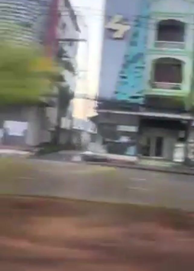 view of a city street from a moving vehicle, likely a train or bus. Buildings, some painted in pastel colors, line the street. The street is wet, possibly from rain. A few cars are visible. The overall impression is of a quiet urban environment.