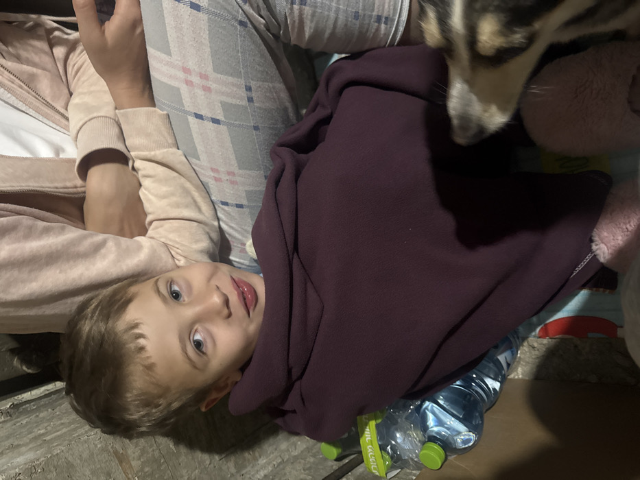 An indoor scene depicts a young male child, approximately 6-8 years old, with light brown hair and blue eyes, positioned in the left foreground and looking directly at the viewer with a slight smile. He is covered in a dark plum-colored fleece material. To the boy's left, two clear plastic water bottles with green caps are visible, one featuring Hebrew text "מי עדן" (Mei Eden) on its label. Behind and to the right of the child, a partially visible adult, likely female, is seated. She is wearing a light pink velour zip-up jacket over a white garment and grey plaid-patterned pajama pants. Her right arm is bent at the elbow. In the lower-right foreground, the head of a domestic cat with striped fur (tan, black, white) is visible, facing towards the left. A light pink, fluffy slipper is partially visible near the cat. A patterned fabric with red and blue elements lies beneath the boy. The immediate background consists of a dark, textured wall, appearing to be concrete or an unfinished interior surface. The environment is consistent with a protective space, such as a bomb shelter or safe room, in Tel-Aviv, Israel.