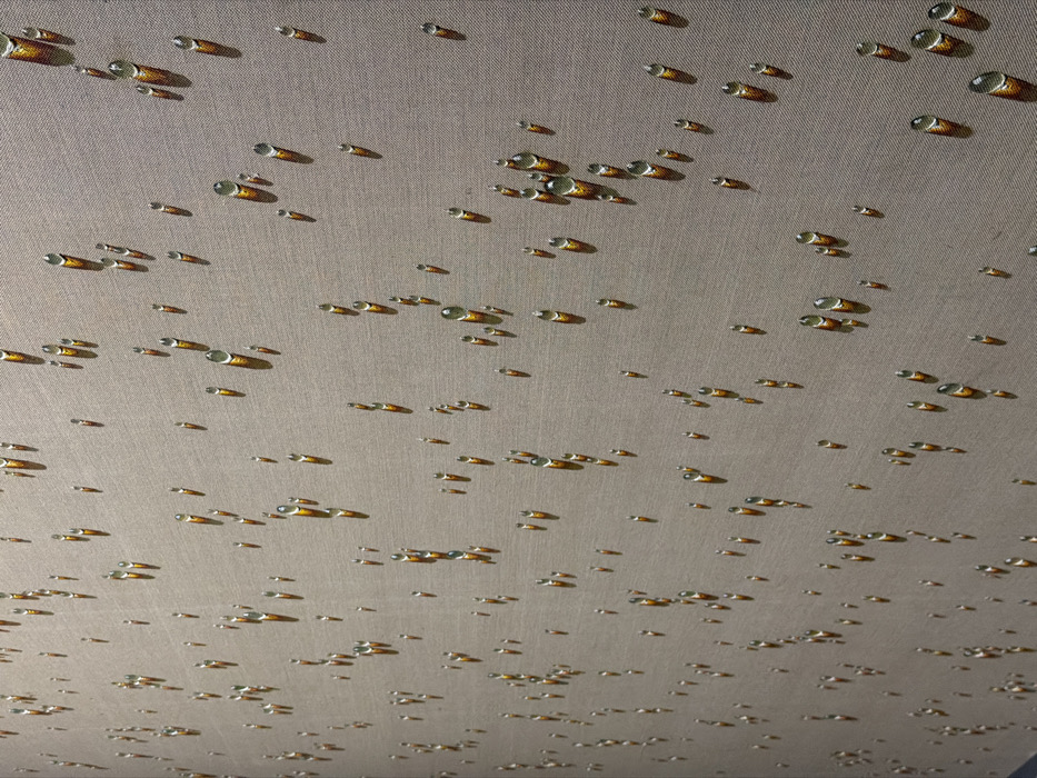 A repeating pattern of small, elongated objects resembling capsules or drops covers a textured, light-colored surface. Each object features a darker, rounded end and a lighter, elongated body with a subtle shadow suggesting depth. The distribution is dense, with the objects decreasing in size towards the lower portion of the image, creating a sense of perspective. The surface appears to be a fabric or textured material.