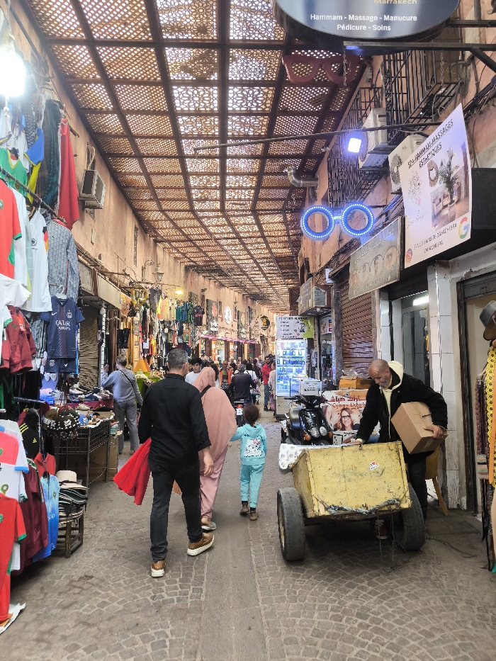- "This image captures a bustling, narrow commercial street, identifiable as a market or souk in Marrakesh, Morocco, given an overhead sign advertising "Hammam - Massage - Manucure Pédicure - Soins" in "Marrakech"" by FM-jgNAL2, licensed under CC BY 4.0